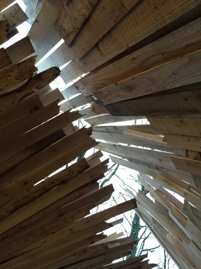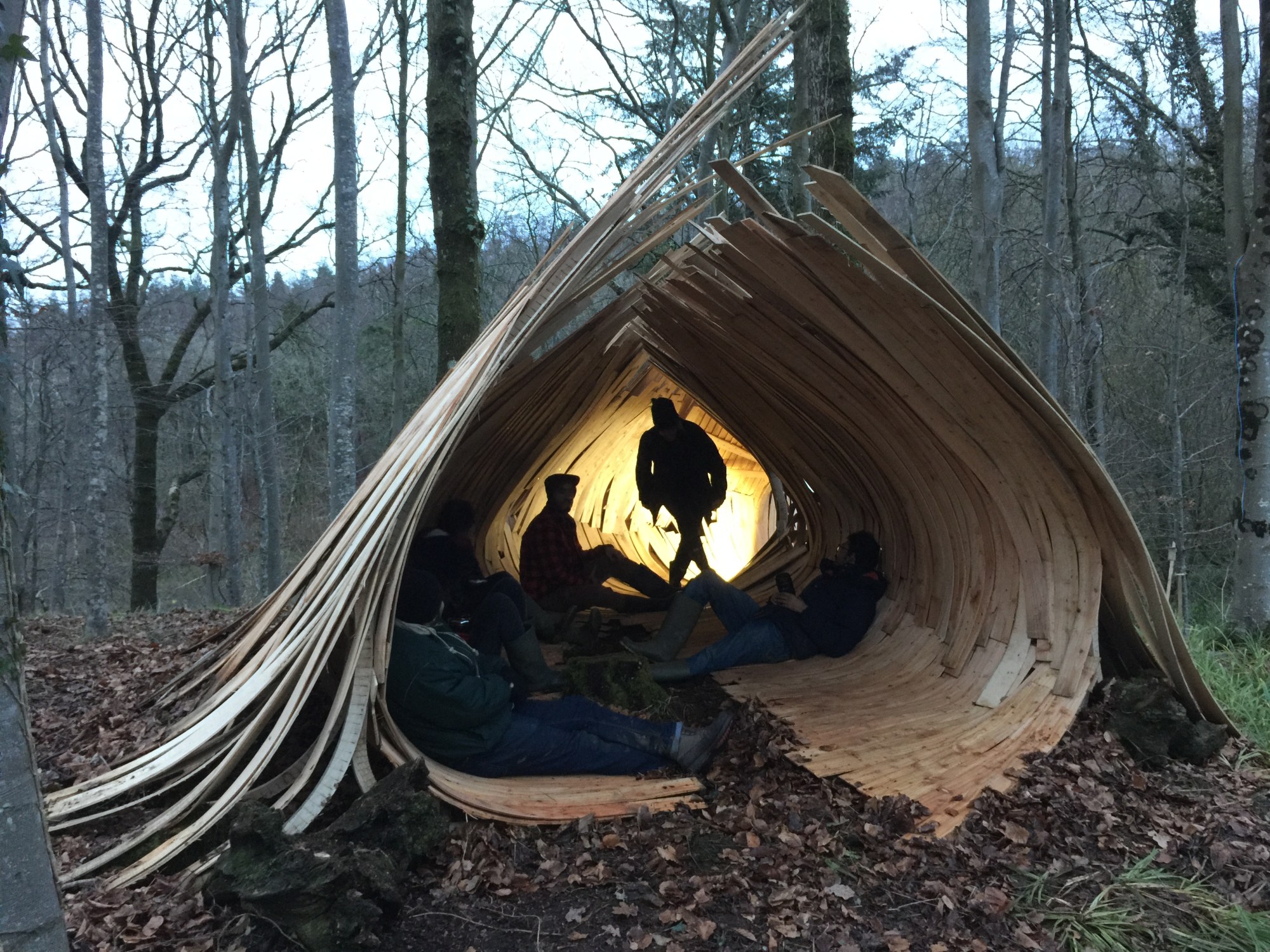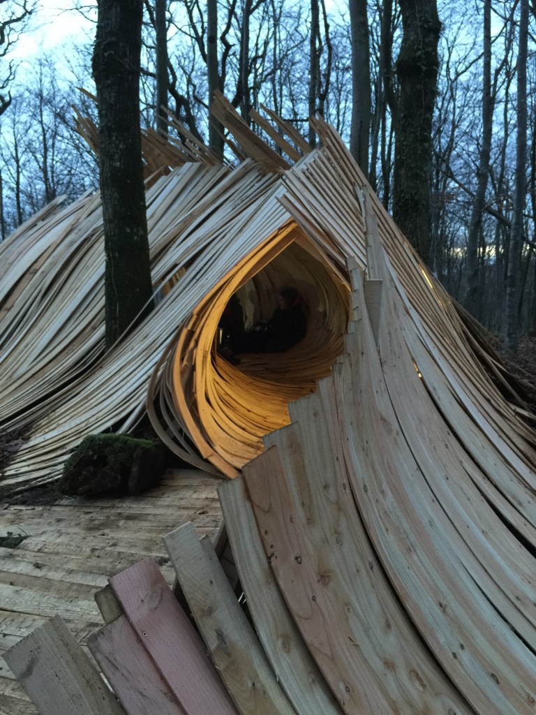 Under the tutelage of Toby Burgess this folded wood pavillion was designed and built by the Architectural Associations’s Design and Make students in Hooke Park Dorset. The Design and Make Masters Course is the rural arm of the Architectural Association exploring innovative uses of timber.